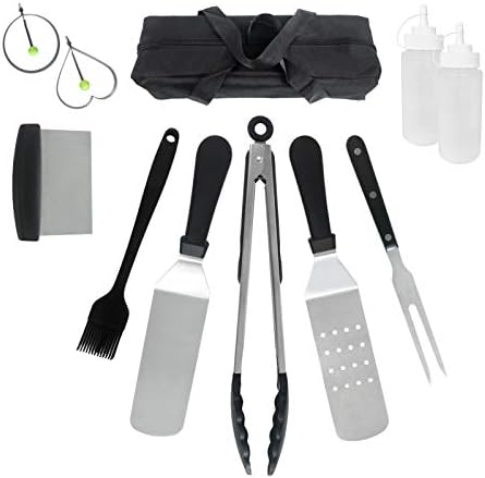 HONNIYOYO Barbecue Tool Sets Flat Top Griddle Accessories Grill Kit Cooking Tools 11 Pcs with Scraper, Spatula, Fork, Tongs, Brush, Egg Rings, Bottles for Outdoor BBQ, Teppanyaki, Camping, Picnic