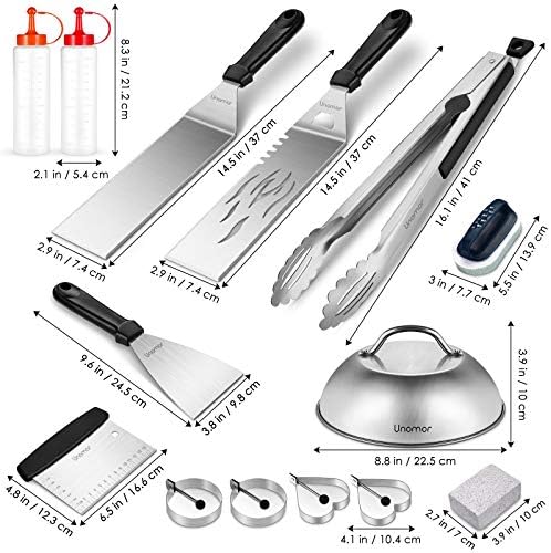 Unomor Griddle Accessories Kit, 18PCS Flat Top Grill Tools Set with Cleaning Tool, Spatula, Basting Cover, Tongs, Scraper, Carrying Bag – Griddle Utensils Kit for Outdoor BBQ, Teppanyaki and Camping